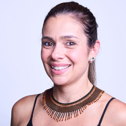 Esses colares são feitos à mão por povos originários brasileiros, utilizando técnicas que envolvem miçangas e fio de nylon. Cada peça é única e carrega consigo a história e o conhecimento transmitidos de geração em geração.